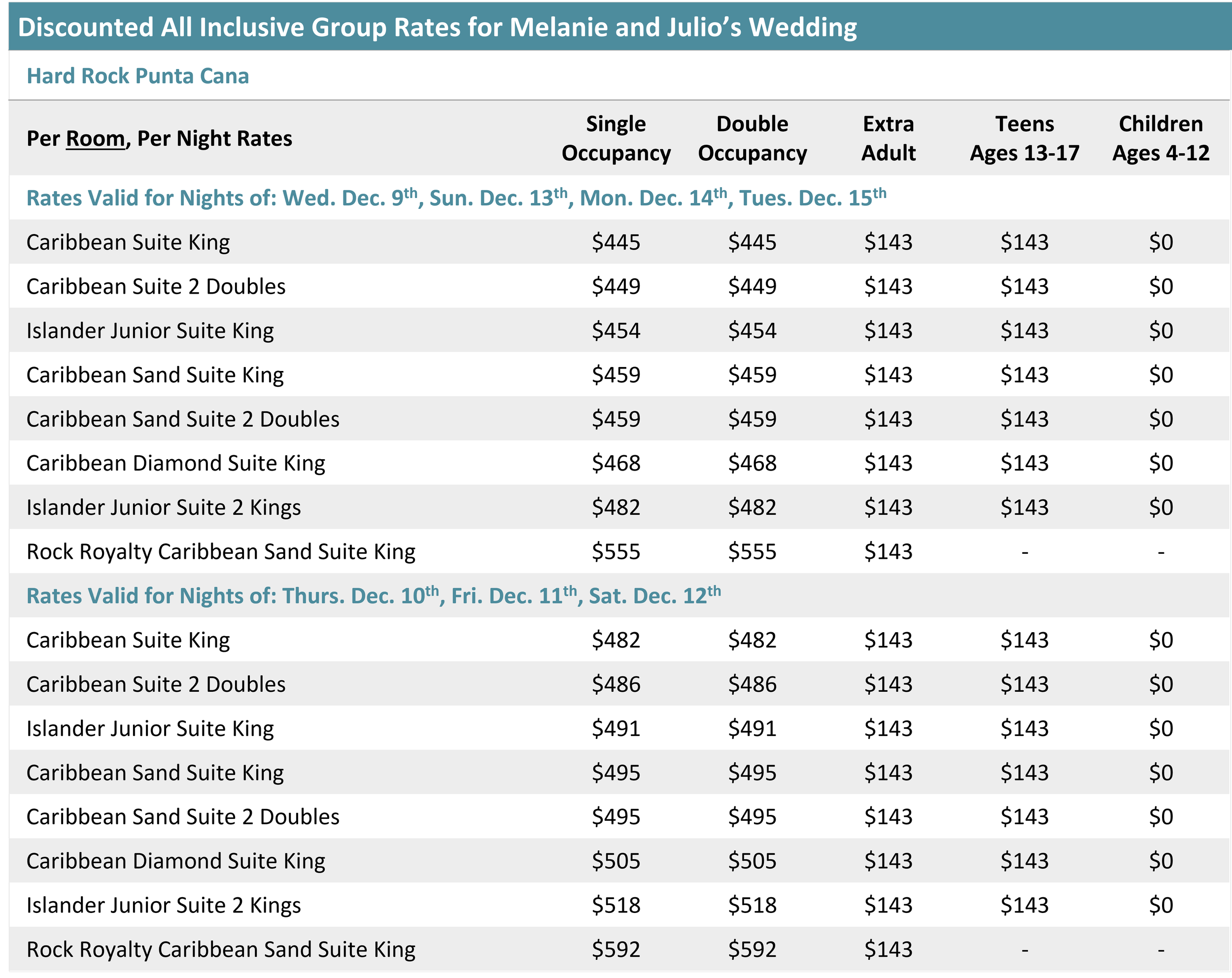 Rates above are in USD and include hotel taxes and fees; The first two guests regardless of age are charged as adults in most room categories; Infants and children 0-3 are free but count towards max occupancies; Reservations must be made using discounted group rates on this site to attend wedding events; 3 nights minimum required